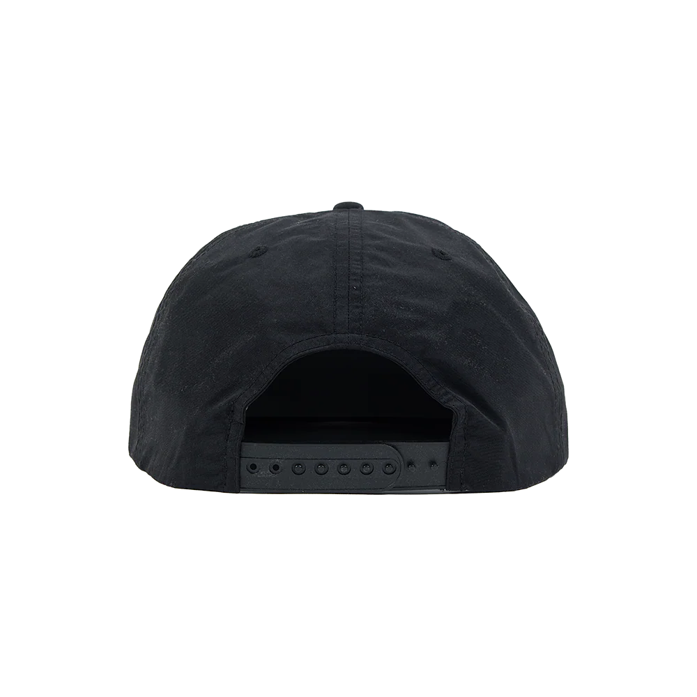 Black surf cap with printed graphic on front. One-size fits all.100% recycled nylon