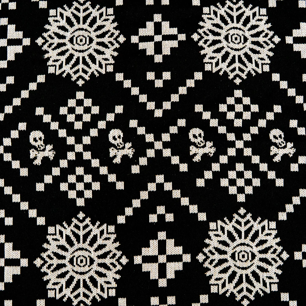 Woven blanket with custom black/white artwork and multi-colored fringe. 50" x 60"